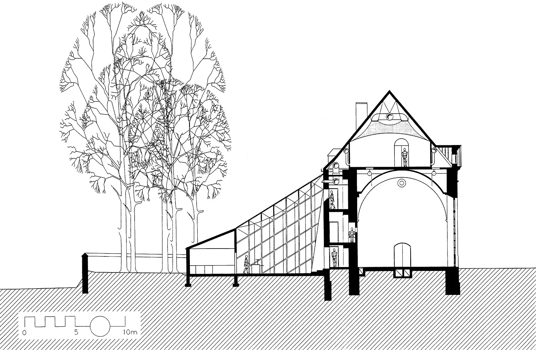 Afin de remplir efficacement sa fonction, la vaste salle voûtée est entourée des côtés nord, est et ouest de galeries l'isolant du froid, tandis qu'elle s'ouvre vers le parc, côté sud, par de larges baies en plein cintre garnies de châssis à petits-bois. L'intervention visant à installer au sein du bâtiment une cafétéria susceptible de se muer en salle d'exposition ou de spectacle se veut respectueuse de l'architecture néoclassique existante. C'est pourquoi l'essentiel de l'intervention porte sur l'ajout d'un volume bas au nord, dans l'angle du mur de clôture du parc et d'une structure légère de métal et de verre, unissant la nouvelle construction à l'orangerie.