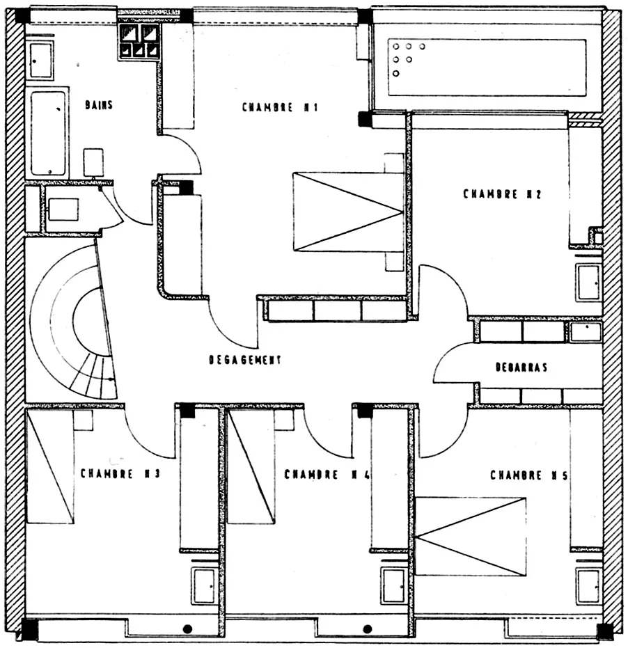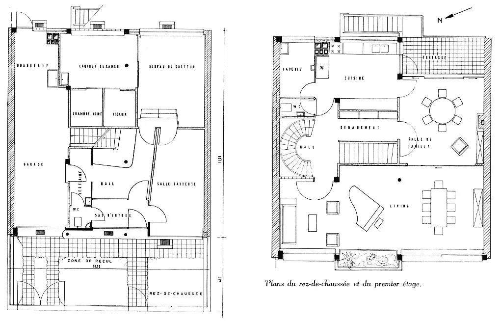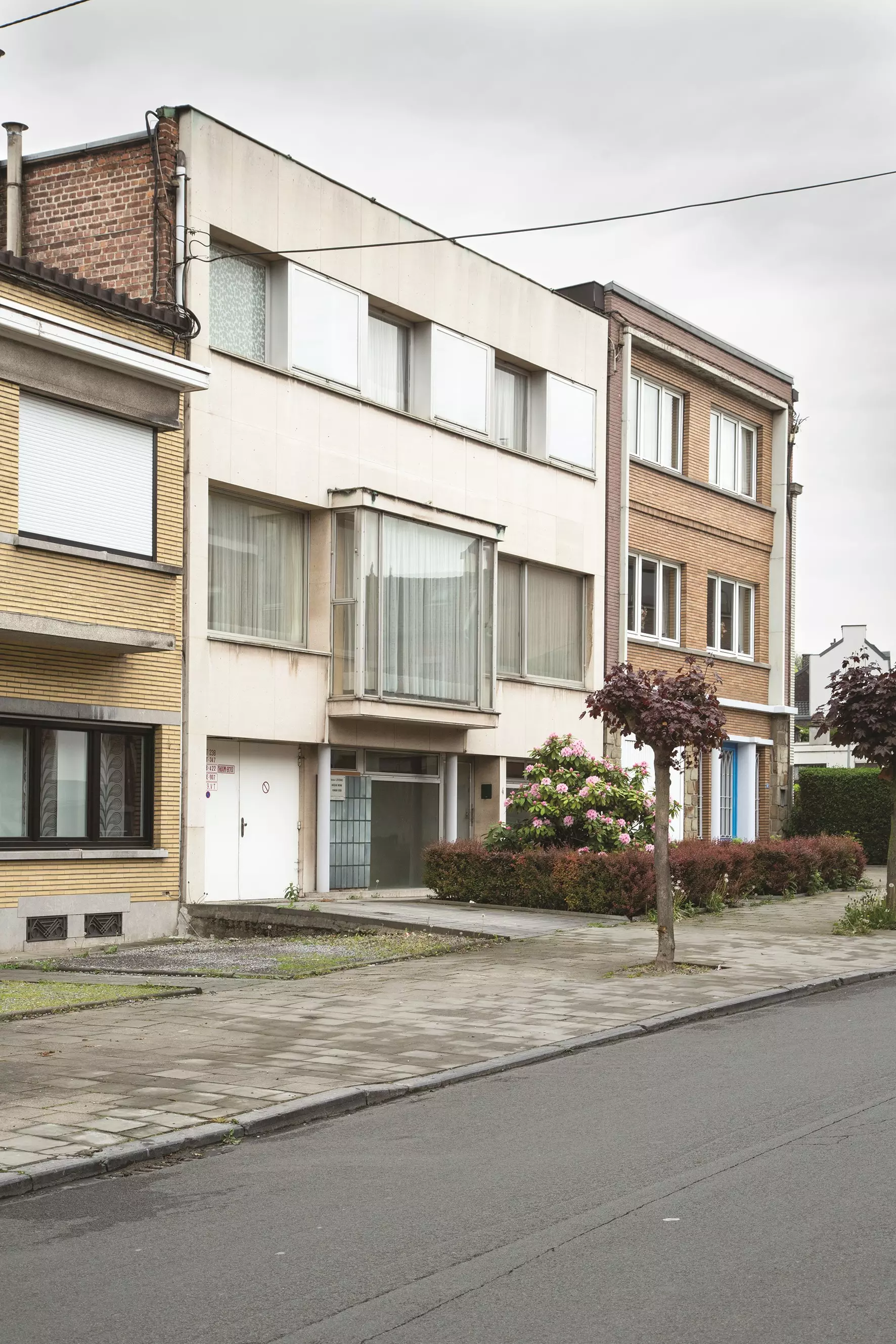 L'écriture est élégante et proportionnée. La façade à rue, d'apparente simplicité, révèle sur chaque niveau une articulation différente. Au rez-de-chaussée, l'ensemble des baies est en léger recul et deux minces colonnes rondes induisent une perception de profondeur. Au premier étage, une loggia vitrée du sol au plafond s'inscrit dans la grande baie en bandeau et enrichit les espaces du séjour. Au deuxième niveau, une grande baie qui occupe, comme au premier étage, toute la largeur de la façade alterne des châssis à fleur de façade et des renfoncements.