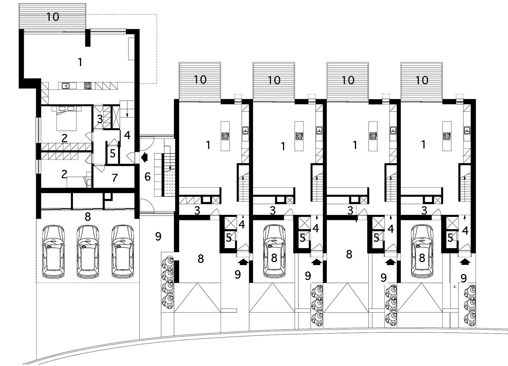 Seule la première livraison de sept logements – sur les cinq phases qui étaient initialement prévues – a été réalisée. Les architectes inscrivent avec justesse le projet dans le paysage de la crête de la colline, récemment défigurée, sur la même avenue, par un groupe d'immeubles à appartements clé-sur-porte.