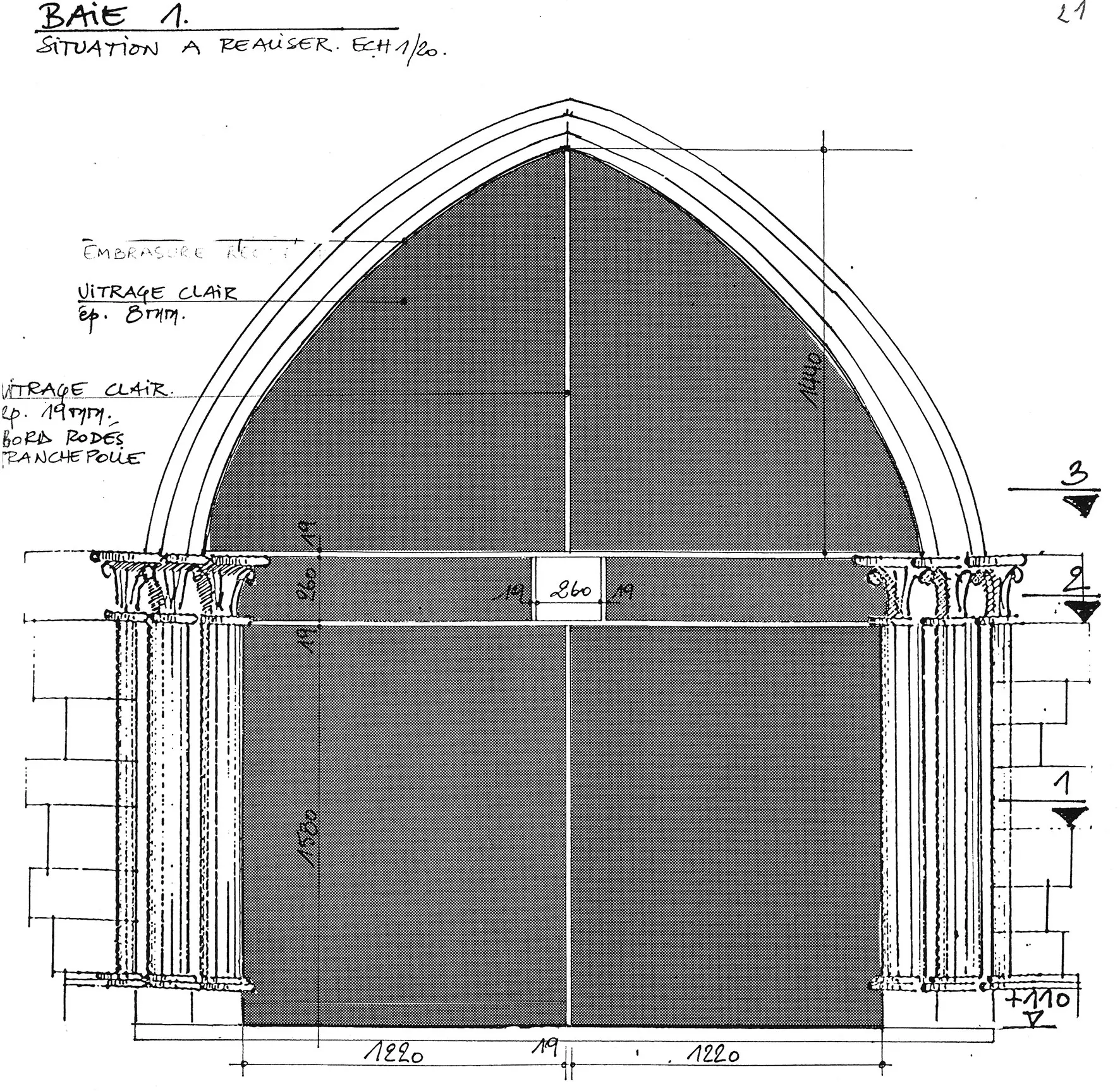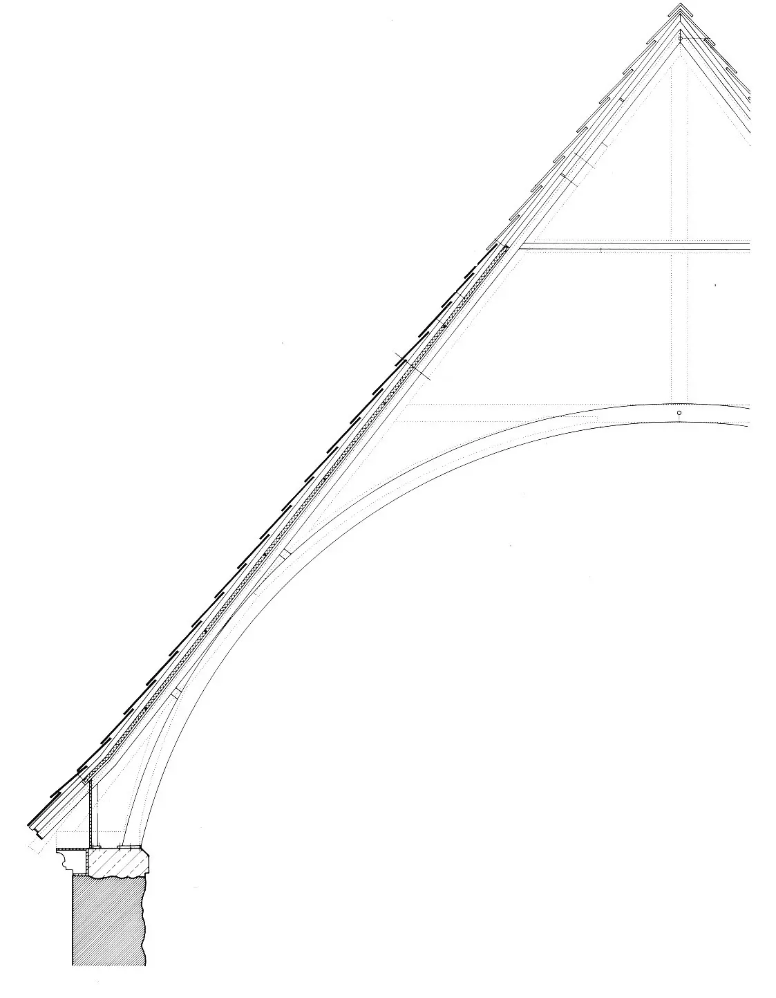 Chacune des interventions de sauvegarde s'est faite dans un esprit de réécriture contemporaine des principes anciens ; simplicité minimaliste cistercienne pour les charpentes de remplacement en acier, baies mosanes à croisées en profils de verre collés, grande porte en acier autopatinable, couverture en tuiles d'acier autopatinable ou en plaques de polycarbonate apportant une abondante lumière zénithale magnifiant l'espace.