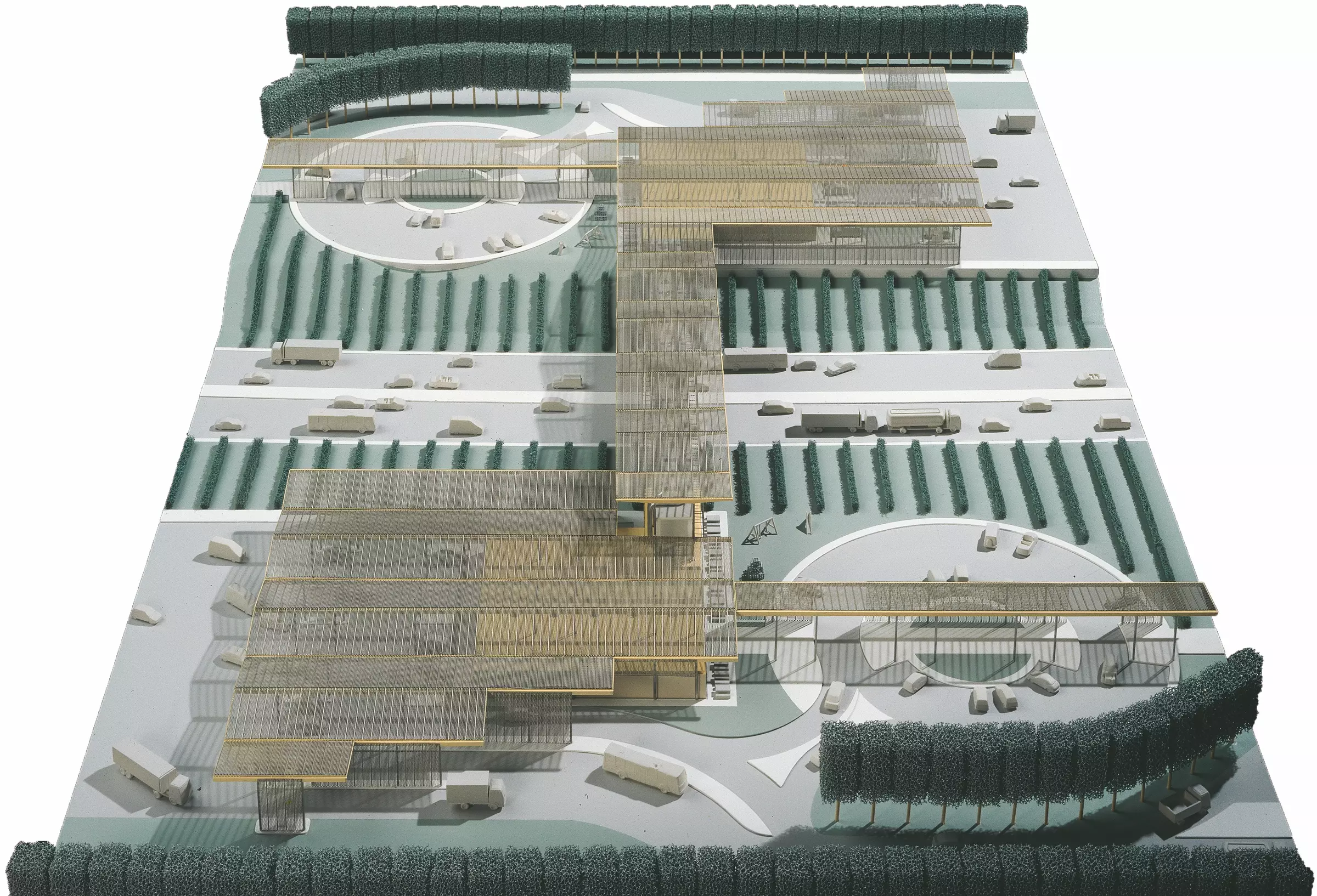 Les deux entités de la station, implantées de part et d'autre de l'autoroute, sont reliées entre elles par un « pont-restaurant » enjambant les voies. L'ensemble de la structure est réalisé en acier et couvert de tôles profilées, en référence aux serres des zones agricoles. Les façades du restaurant sont habillées de métal déployé. L'homogénéité de l'ensemble et l'uniformité des matériaux contribuent à l'intégration dans le paysage. Au-delà de sa fonction de ravitaillement et de repos des voyageurs, l'aire s'est donné la vocation d'être un lieu didactique, un centre d'animation et une vitrine régionale des activités locales, par les équipements et les aménagements proposés.