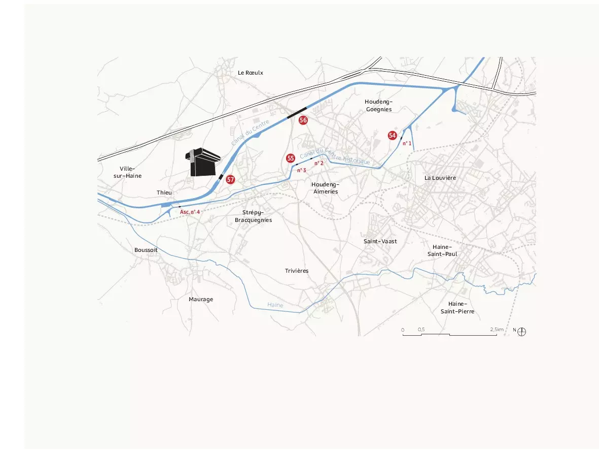 La création du canal répond au besoin de relier le bassin de la Meuse à celui de l'Escaut. En 1879, confronté au problème d'un dénivelé de 96 m sur 20 km, le Gouvernement choisit de s'inspirer de l'ascenseur d'Anderton en Angleterre en établissant une voie d'eau à 300 t avec cinq écluses et quatre ascenseurs hydrauliques. En raison de problèmes d'étanchéité, leur mise en service n'intervient qu'en 1917. Ces ascenseurs - les derniers au monde à fonctionner exclusivement à l'énergie hydraulique - sont classés par la Wallonie en 1992 et repris sur la liste du Patrimoine mondial de l'Unesco en 1998. En 2004, la porte de garde Blanc Pain (Atelier d'architecture Carré 7 [Bernard De Vrée], 2002-2004), située à 5 km en amont du pont-canal, permet de diminuer les risques d'inondation et d'isoler la section b du canal jusqu'à l'ascenseur funiculaire. Le nouveau canal, ouvert à la navigation en 2002, répond à la volonté des autorités européennes de porter le gabarit des voies d'eau d'intérêt international à 1 350 t. La loi du 9 mars 1957 décide l'exécution urgente de travaux de modernisation qui commencent en 1963. L'aménagement de la section d'Havré à Houdeng nécessite le remplacement des vieux ascenseurs hydrauliques par un ascenseur funiculaire unique inauguré en 2002. (voir : L'ascenseur n°1 ; L'ascenseur n°3 ; Le pont-canal du Sart ; L'ascenseur funiculaire de Strépy-Thieu)