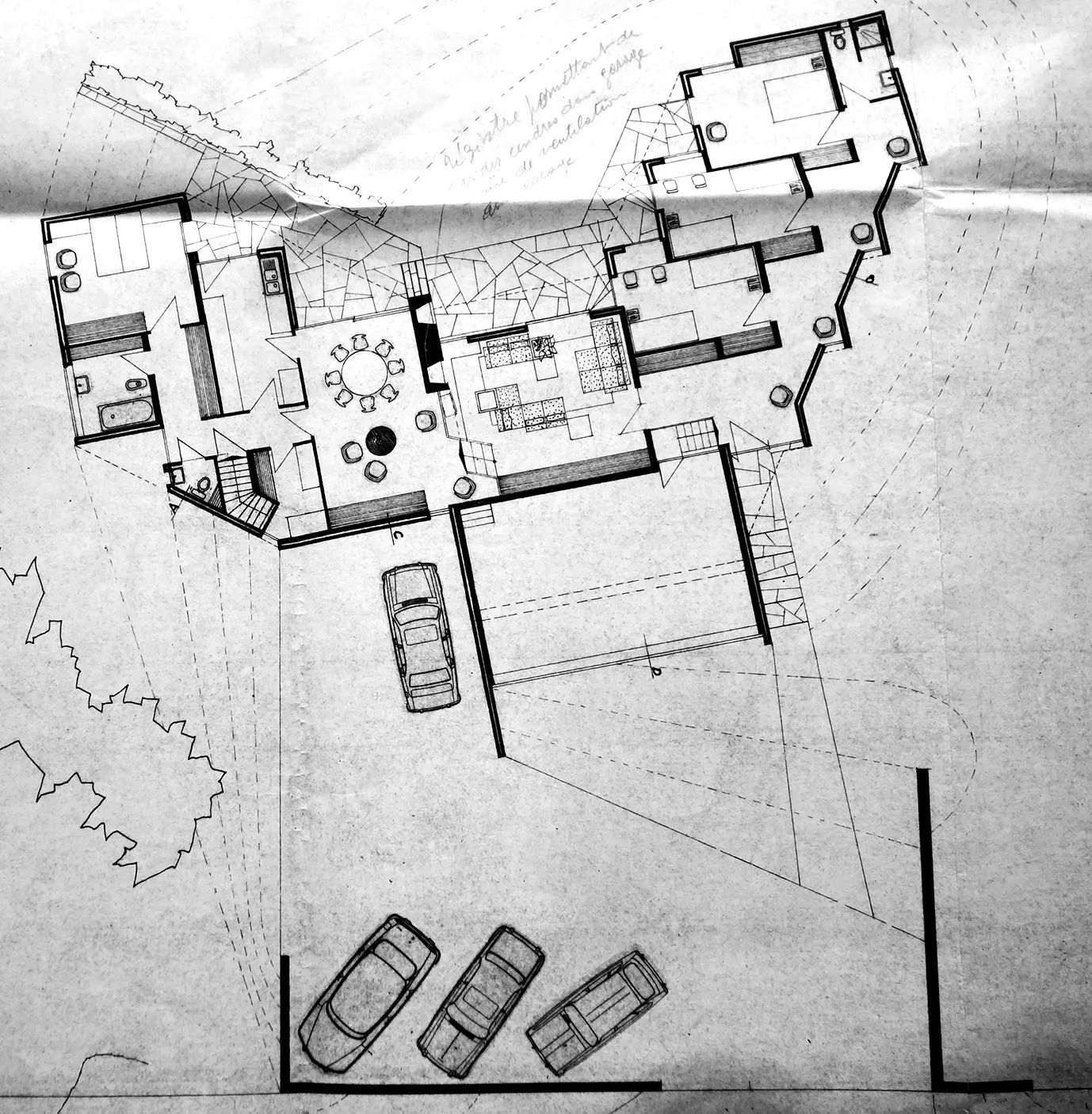 À l'avant, l'atelier du peintre, à demi enterré, est éclairé par la lumière du nord. Les murs délimitant les chambres servent de cimaise et le couloir qui les dessert devient une galerie éclairée par d'étroites baies sans allège.