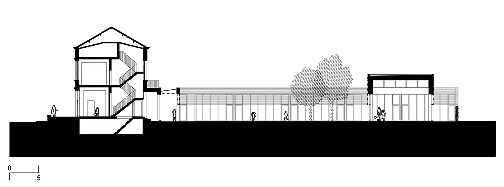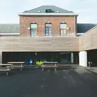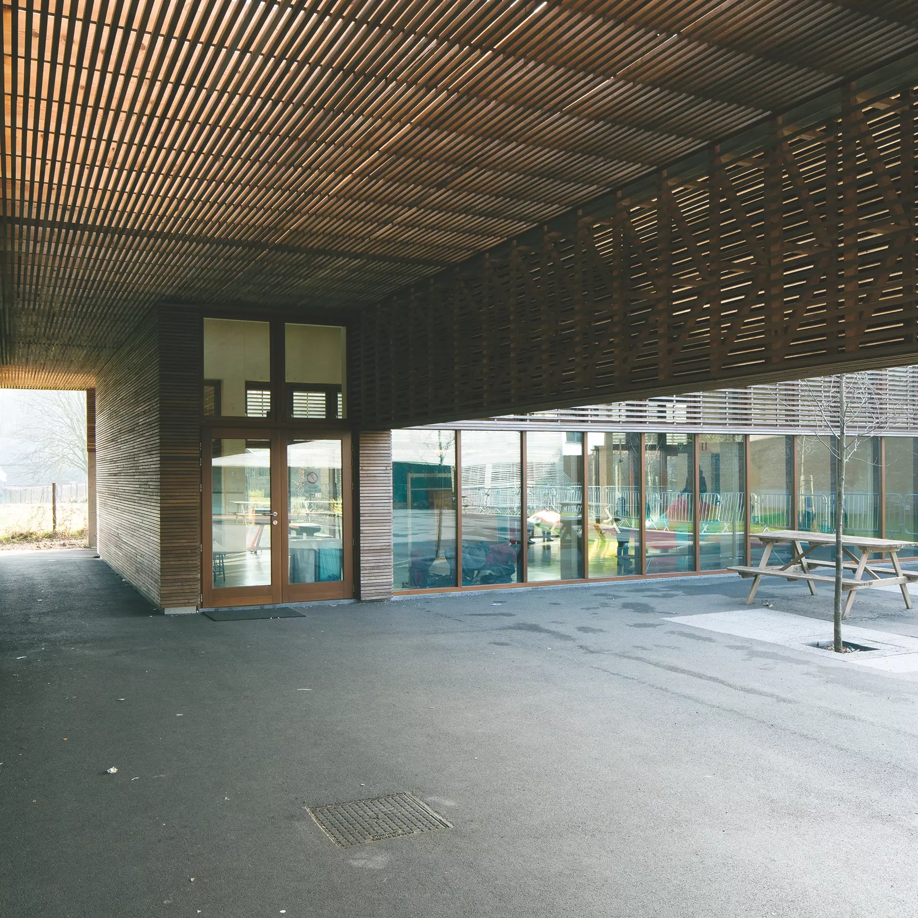 Un préau, également en bois, relie les trois volumes construisant la nouvelle identité de l'établissement dans un esprit communautaire. L'intégration paysagère offre une qualité importante à la vie du bâtiment, restituant l'école au cœur du village et renouant avec l'histoire locale. C