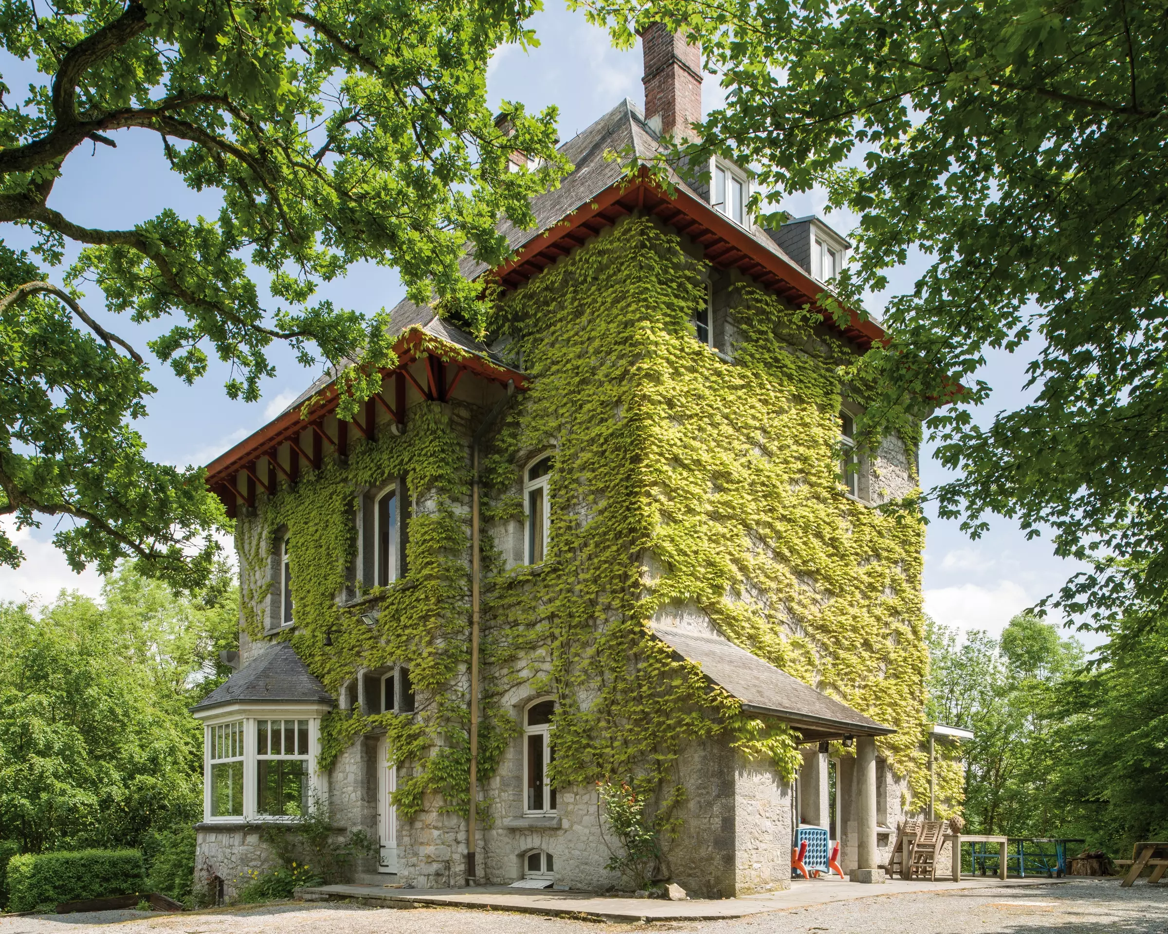 Le plan est conçu de manière à profiter au maximum des meilleures vues, ainsi le séjour est orienté au nord et la cuisine au sud. La hauteur des niveaux et l'utilisation d'une toiture débordante à forte inclinaison – recouverte d'ardoises aux tons gris-bleu – donnent à la construction une expression monumentale. Celle-ci est renforcée par la mise en œuvre sobre et soignée du parement en petit granit du Bocq (ou calcaire de Landelies), une variété locale de pierre bleue utilisée aussi dans l'abbaye voisine. Ce matériau habille l'ensemble des façades et des détails, et accentue le caractère monochrome de la construction qui se fond dans le paysage. Les maçonneries sont en moellons irréguliers, tandis que des claveaux mieux appareillés sont utilisés pour les arcs des baies. Horta utilise des éléments taillés pour les corniches, les chaînages d'angle, les meneaux des fenêtres, ainsi que pour les appuis.