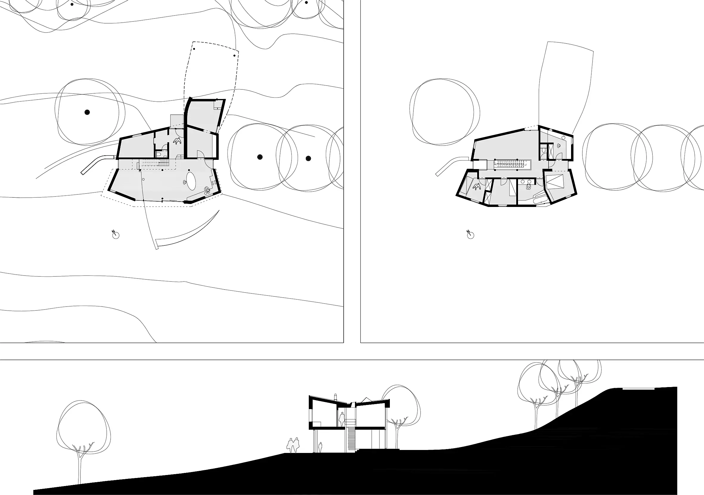 La maison s'implante sur un ancien verger, en contrebas de la rue. Le projet a été élaboré sur la base de l'orientation des pièces de vie et des zones de nuit selon l'ensoleillement, la vue et les vents.