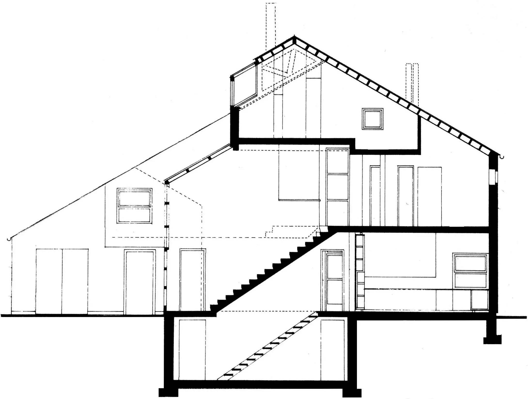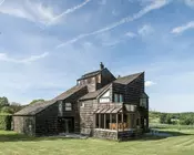 Inspirés du Sea Ranch que Charles Moore bâtit en 1963 sur la côte californienne, l'architecture libérée de cette maison de vacances ainsi que son agencement propice à la vie communautaire témoignent de l'aspiration de la génération soixante-huitarde à défier les conventions. Le plan s'organise avec décontraction autour de l'escalier et de la cheminée, tandis que l'espace du séjour s'ouvre sur le paysage par une véranda débordante. La construction en terre cuite apparente accueille ce programme avec chaleur et vérité, tandis que le bardage en cèdre qui l'abrite se plie aux articulations d'une volumétrie travaillée cherchant à profiter de toutes les vues et orientations. Les formes et les matériaux réussissent une intégration inédite dans ce paysage très ouvert en bordure du village ardennais.
