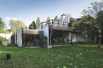 En façade, l'architecte fait dialoguer le crépi blanc, le béton brut et le bois et réinterprète les principaux traits développés dans la maison Goffin : jeu des volumes, façade nord monolithique, toiture plate et fenêtres d'angle.