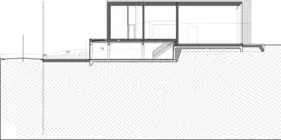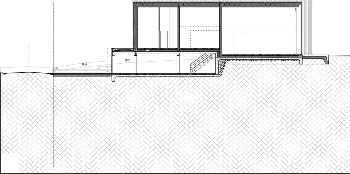 La maison s'inscrit au sein d'un quartier rural mêlant fermes typiques et pavillons récents. Considérant le profil pentu du terrain, une attention particulière est portée aux problématiques d'orientation et d'intégration. Aussi, la division en deux volumes superposés permet de suivre le mouvement des terres et de reprendre les différences de niveaux. Le plateau inférieur s'enterre partiellement et ne reçoit aucune pièce à vivre, uniquement les garages et techniques. Il sert de soubassement au volume principal et de support aux terrasses des chambres. Le plateau supérieur est accessible via un petit volume accolé et dégage un espace libre, offrant une ouverture maximale vers l'arrière. Seule cette partie est traitée selon les critères passifs. En mêlant le respect des reculs, des gabarits et des typologies voisines à la contemporanéité des matériaux et des mises en œuvre (acier Corten et continuité du bardage bois ajouré), le projet opte pour une réinterprétation de la fermette traditionnelle, dont on trouve quelques autres exemples récents dans la région.