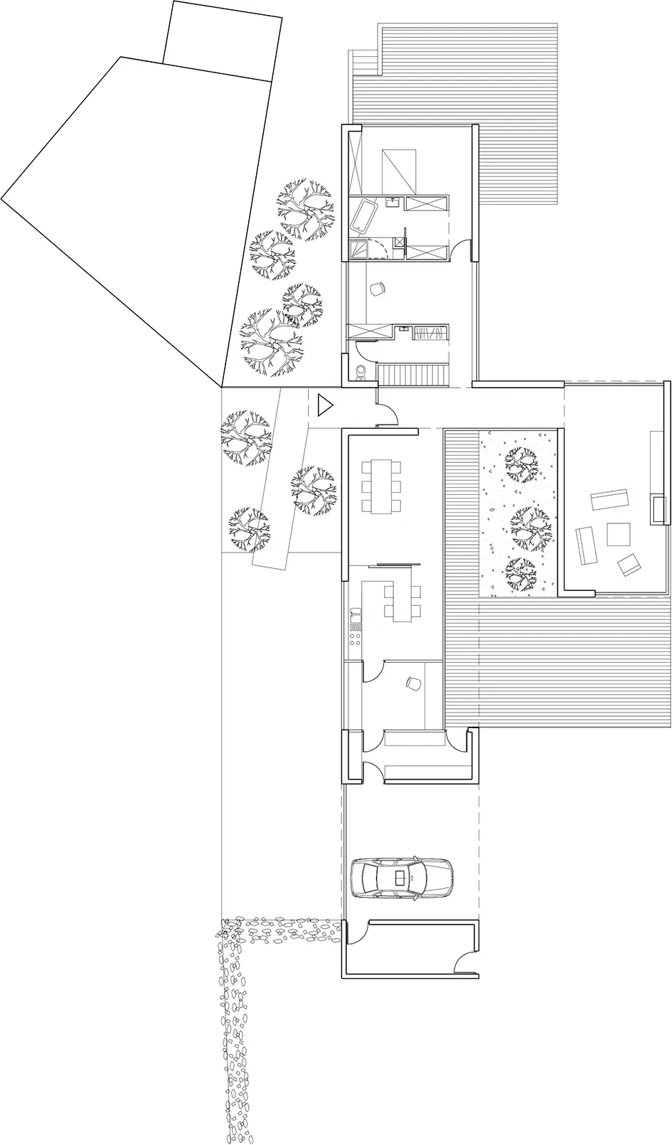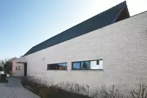 Insérée entre paysages construit et naturel, l'habitation présente deux visages : l'un, fermé, accompagne le front bâti et la perspective de la chaussée ; l'autre, ouvert, fait le lien entre les espaces de vie et les champs alentours. Les deux faces n'en sont pas moins liées par une écriture simple et épurée, favorisant l'intégration aux corps de ferme environnants. Depuis la voie publique, la bâtisse prend la forme d'un long parallélépipède de briques blanches. Clairement dissociée, une toiture à double versant y est simplement déposée, salut ironique aux prescriptions urbanistiques. À l'arrière, un second volume, réservé au salon, se connecte via un pont vitré. Le dénivelé important du terrain est mis à profit dans l'agencement des espaces, offrant des rapports divers au contexte immédiat. Il permet notamment la création d'un étage supplémentaire sous le niveau de la chaussée, d'où le bâtiment apparaît comme de plain-pied.