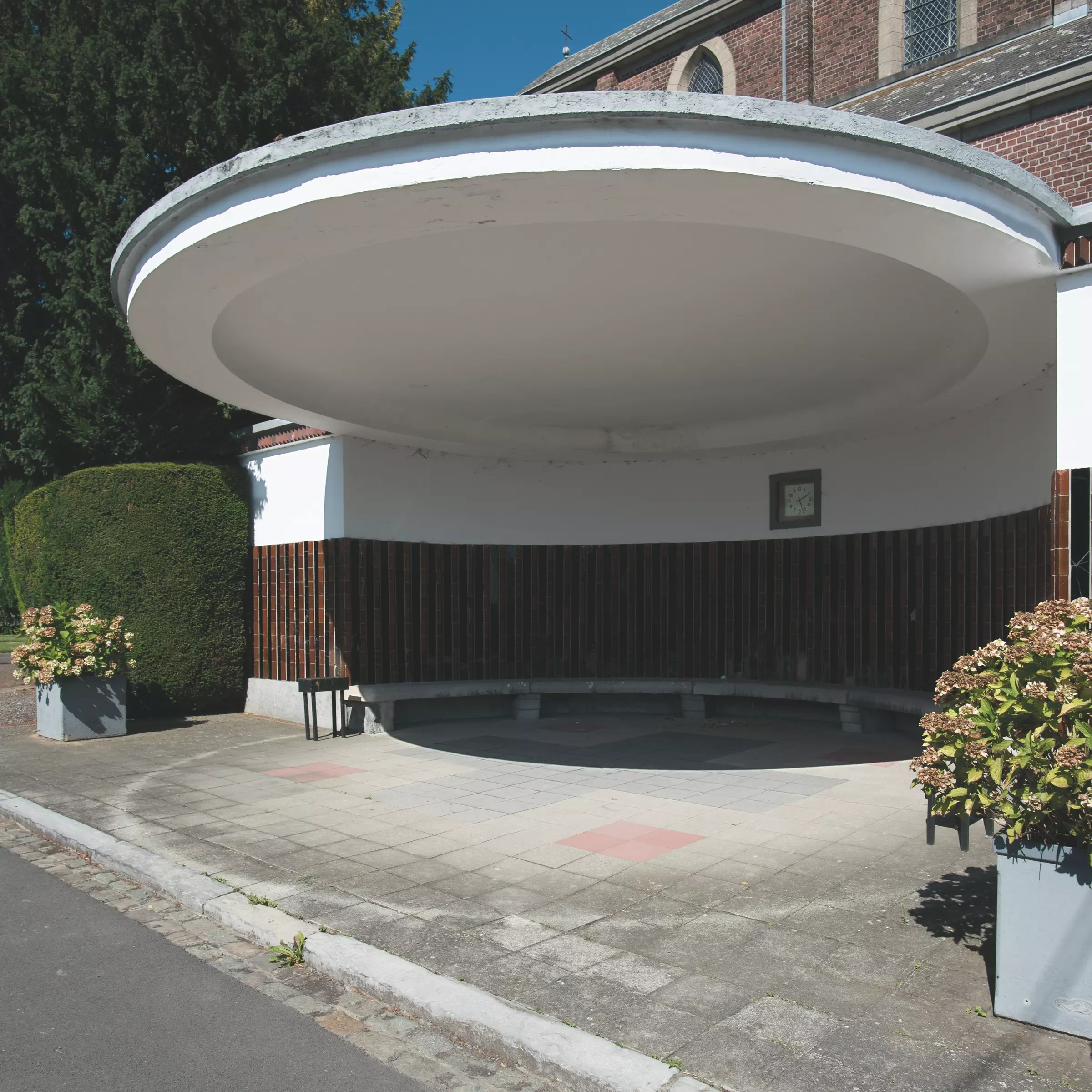 Henry Lacoste, connu pour l'audace de ses options structurelles, présente ici un important auvent sans aucune colonne pour le soutenir dans sa partie avant, preuve de son ingéniosité. Dans un article, il précise que « la niche semi-circulaire est couverte d'une dalle en béton armé inclinée vers l'avant. Au-dessus d'un banc en pierre, règne un lambris où des cannelures triangulaires en terre cuite vernissées alternent avec des bandes de marbrite noire de Fauquez ». S'y ajoute une horloge de format carré, symbole de la terre et de l'homme, mais aussi de la fugacité de la vie humaine. Celle-ci contraste avec le grand cercle de la couverture, symbole du ciel et de l'éternité. Le beau rapport entre le vert et le noir des murs était renforcé autrefois par la représentation polychrome d'une croix au centre du plafond, attirant l'œil vers le haut. On retrouve un vocabulaire identique dans le porche d'entrée des cimetières de Lessines (1929) et de Blandain (1929).
