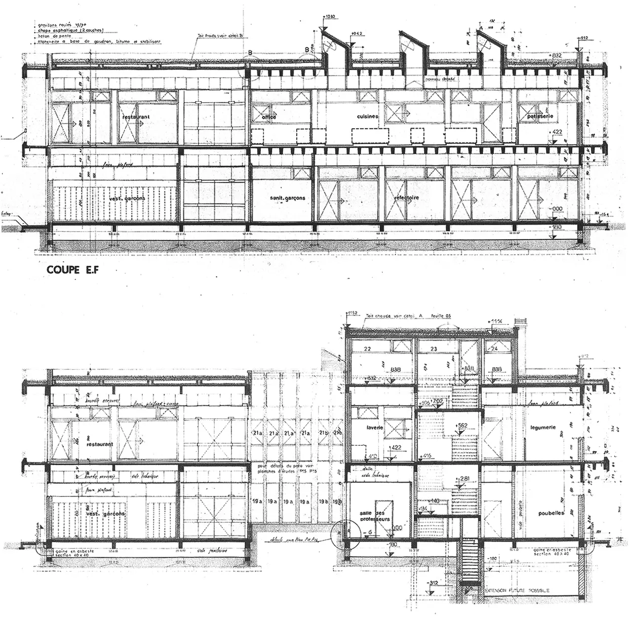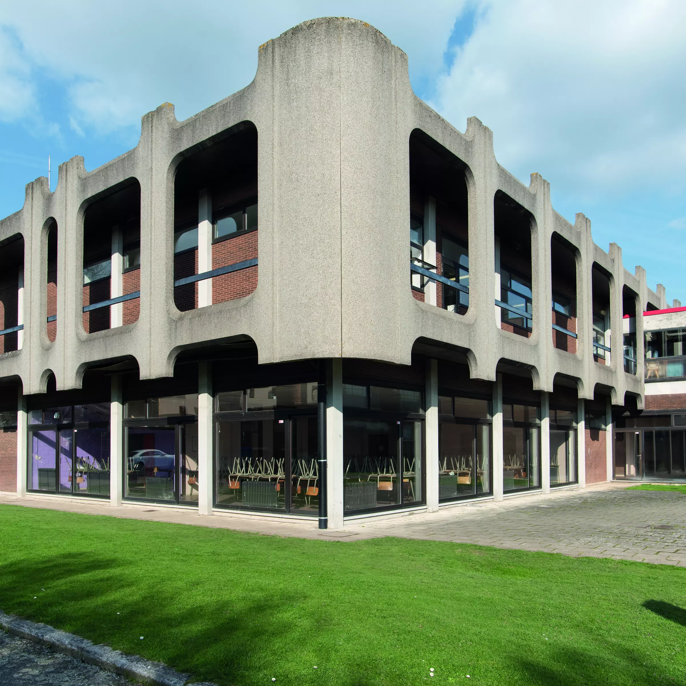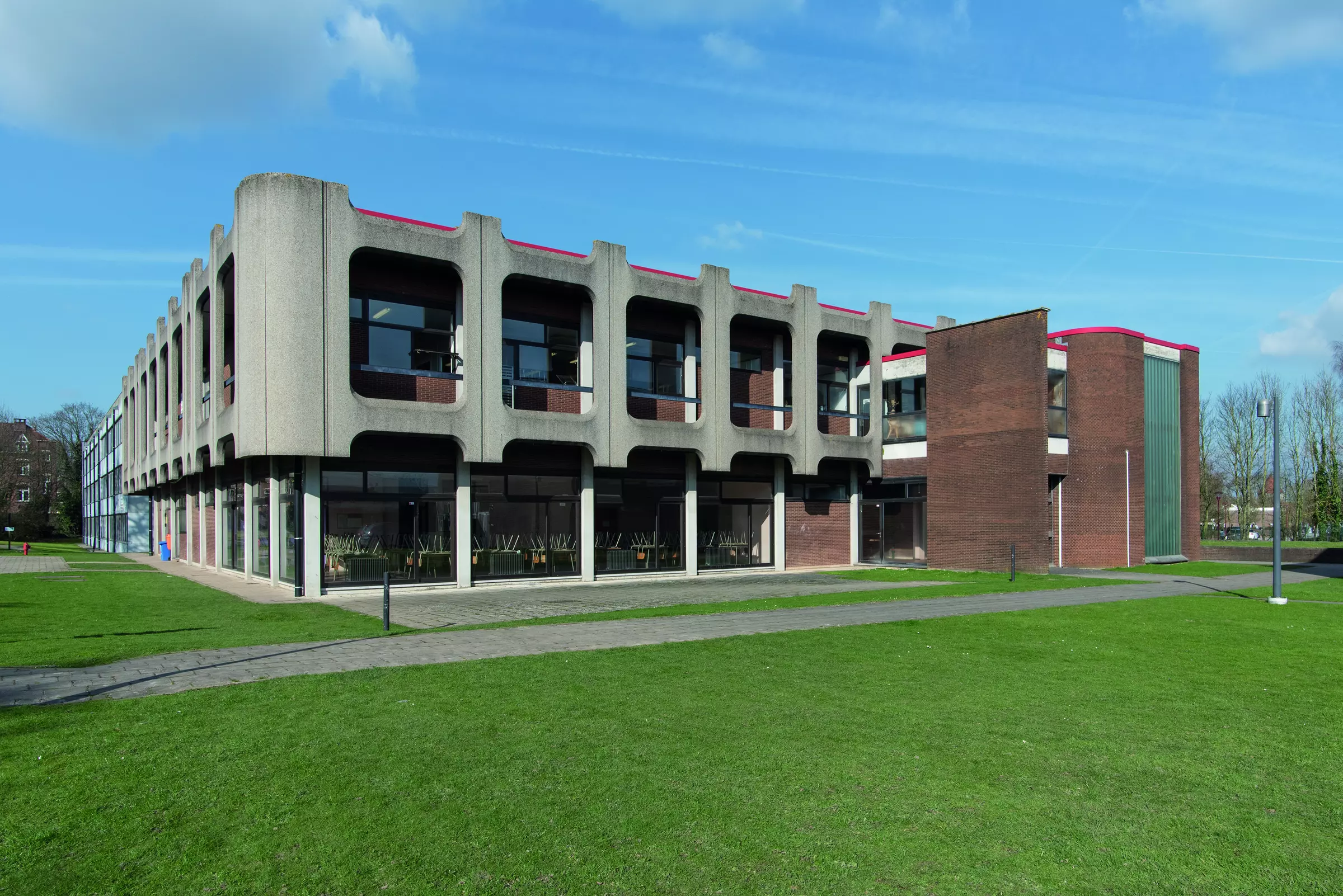 Implanté entre un bâtiment moderne préfabriqué (1972) et un bâtiment vernaculaire construit a posteriori (1993), l'édifice accueille la section cuisine de l'institut. Son rez-de-chaussée est organisé de part et d'autre d'une promenade rythmée par une structure apparente et reliant les bâtiments du site entre eux. Cette promenade dessert un hall d'accueil ouvert et un patio central orné d'un relief réalisé par le céramiste Owczarek. L'emprise au sol étant limitée, les cuisines et le restaurant didactique sont positionnés à l'étage. Pour que ce dernier réponde à la vocation pédagogique, il s'est agi, lors de la conception, de dessiner « un vrai beau restaurant moderne permettant l'immersion de l'étudiant » (B. Lepers). Pour cette raison, l'accès à la salle se fait directement de l'extérieur par deux escaliers monumentaux. Les finitions intérieures y sont particulièrement fastueuses (plafond réfléchissant en cuivre). L'enveloppe, entièrement vitrée, est parée d'une interface en béton préfabriqué qui « transforme le paysage, lui donne un cadre ». De l'extérieur, flottant en porte-à-faux au-dessus d'un socle en briques, ce couronnement signale le caractère précieux de la fonction qu'il recèle, à la manière des péristyles classiques. Dans une perspective historique, les trois bâtiments présents sur le site (dépouillement, retour à l'ornement, retour au vernaculaire) illustrent bien la mutation esthétique opérée en deux décennies sur notre territoire.