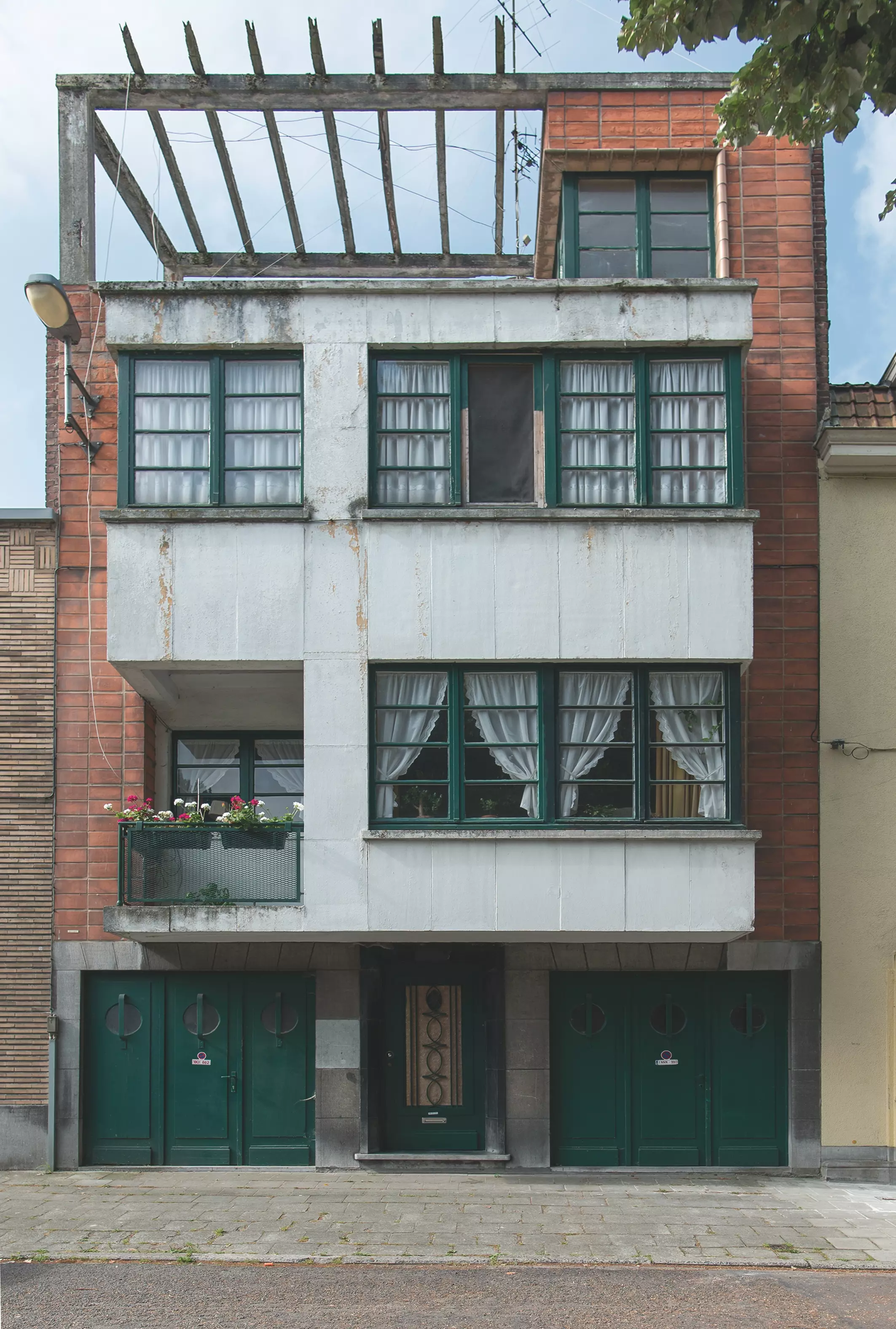 Cette maison mitoyenne de quatre niveaux se démarque de son environnement par sa dominante verticale. La composition de la façade, très orthogonale, joue sur deux volumes principaux : un élément en relief, correspondant au double bow-window de béton armé (dont les divisions de châssis ont été remplacées et réduites à la suite du manque d'approvisionnement lors de la reconstruction) et un élément en creux, correspondant à la pergola du toit-terrasse. Des céramiques orangées rehaussent et donnent un ton chaleureux à l'immeuble. Un escalier de forme semi-cylindrique dessert l'immeuble par l'arrière. Le seul volume prégnant de ce côté du bâtiment bénéficie d'un fort éclairage grâce à ses quatre baies verticales. L'ensemble, resté dans l'esprit de l'époque, nécessiterait certaines réfections importantes (notamment les toitures en zinc et béton).