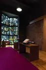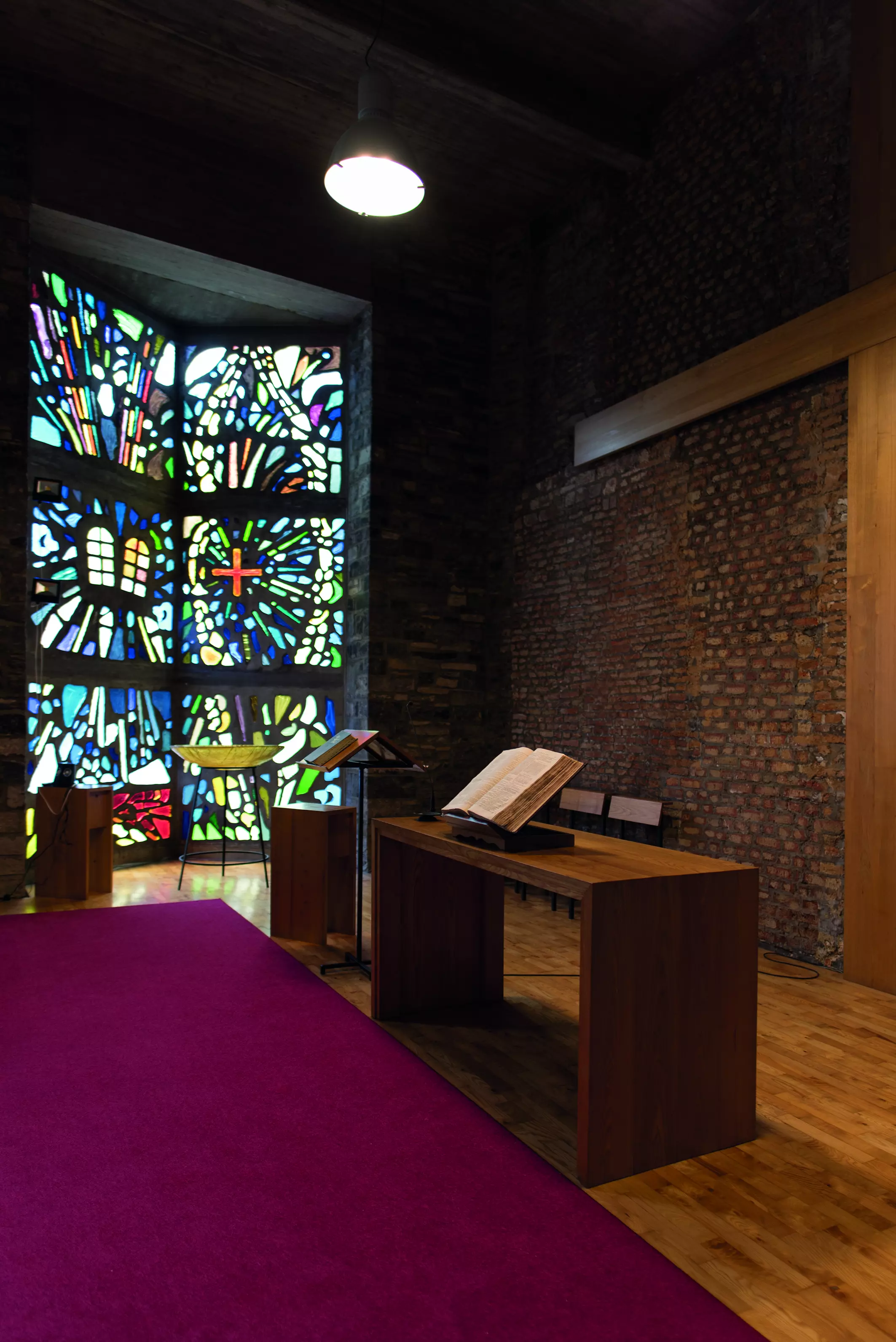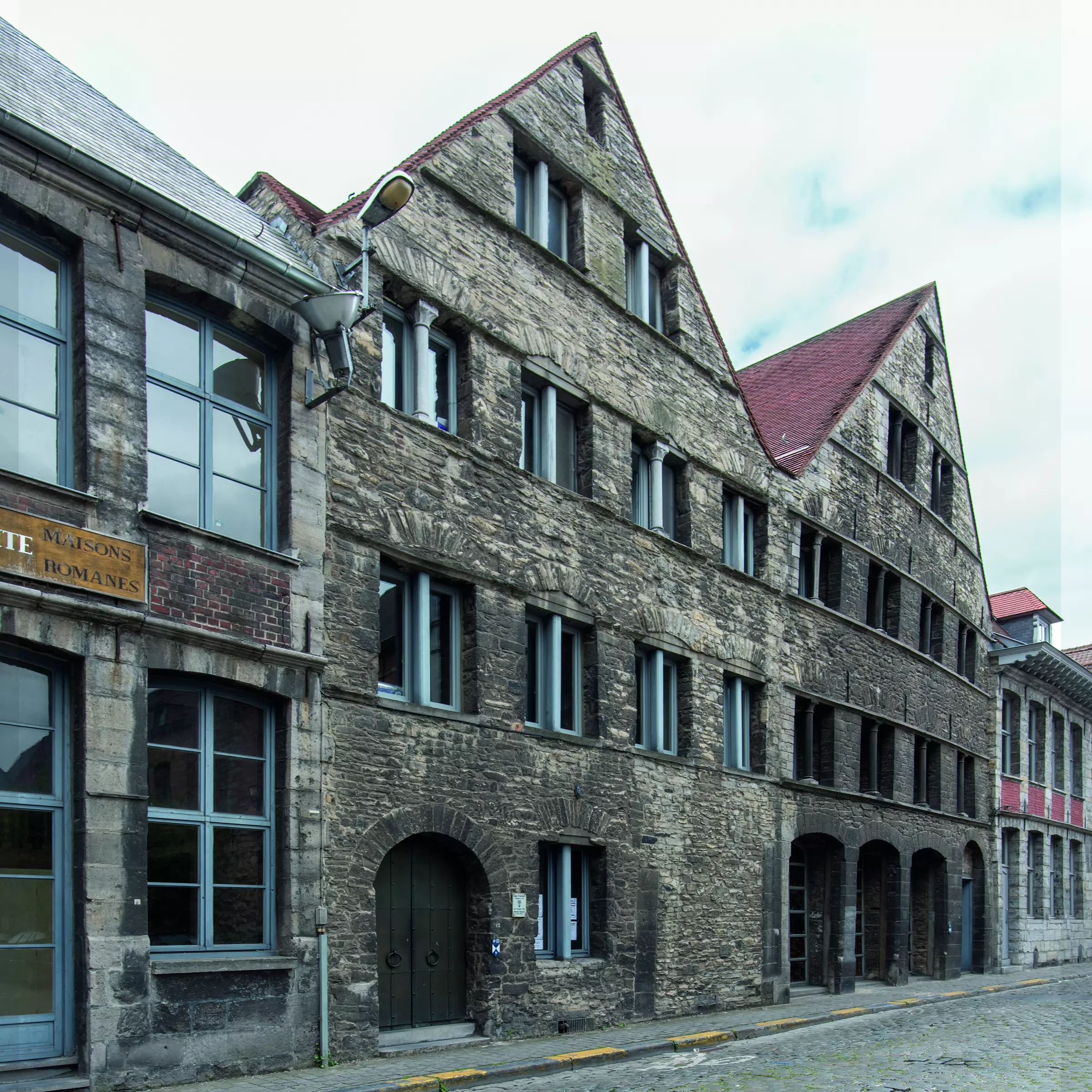 En 1957, la Ville de Tournai décide d'installer dans les deux maisons mitoyennes en pierres dites « romanes » (XIIe siècle) un temple protestant avec l'habitation du pasteur. Les plans sont confiés en 1962 à Lacoste, réputé notamment pour son travail sur le site archéologique d'Apamée en Syrie, de 1930 à 1955. Il défend une conservation scrupuleuse des éléments d'origine ainsi que le caractère limité et immédiatement identifiable des interventions contemporaines, en grande partie en béton. Pour se conformer aux besoins de la liturgie, il choisit pourtant de sacrifier l'ancien mur mitoyen. Le chantier ne débute qu'après le décès de Lacoste sous la direction de son gendre, Frans Stiphout, à qui la Commission des monuments et des sites impose plusieurs modifications importantes (1970-1975).