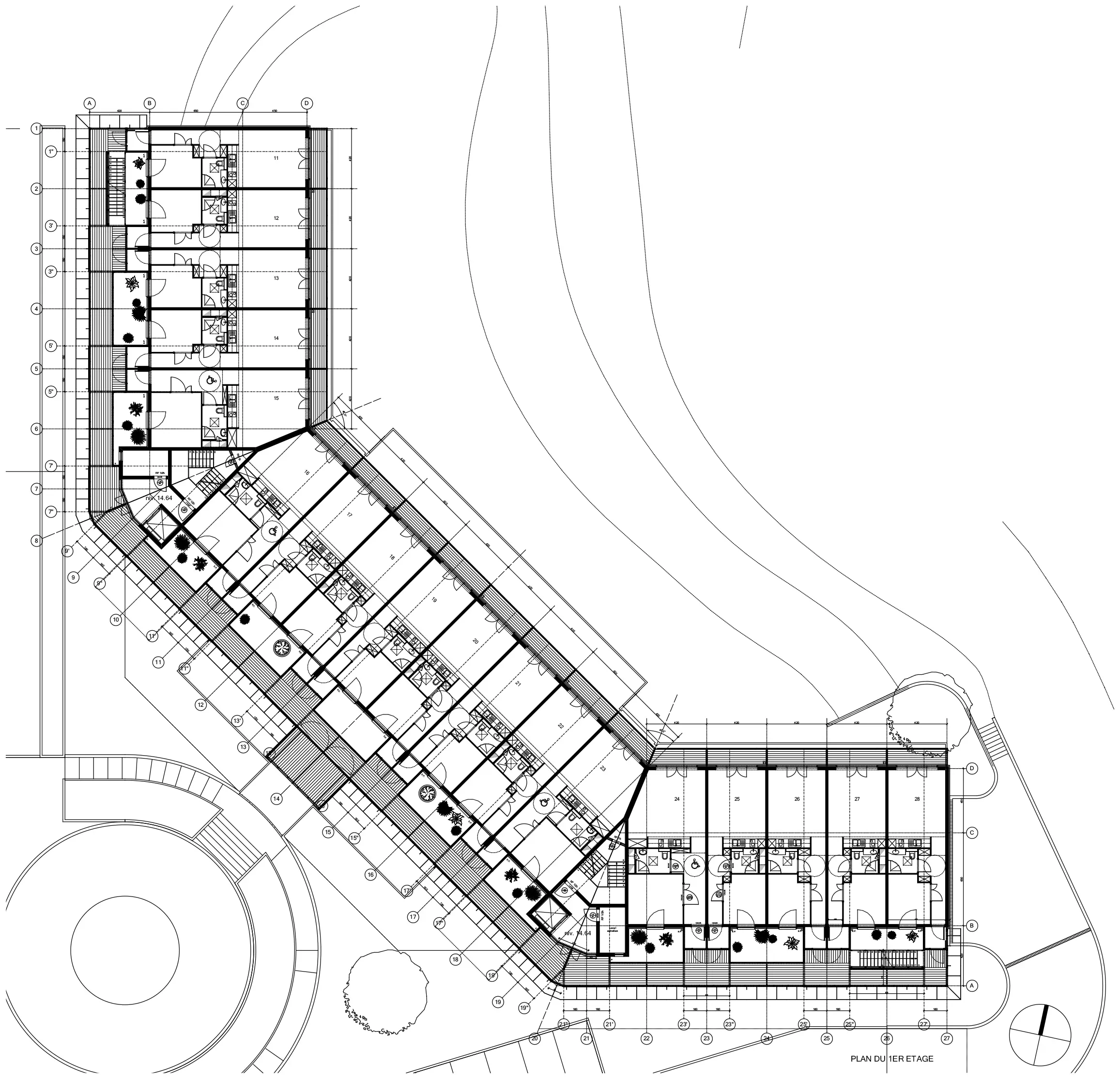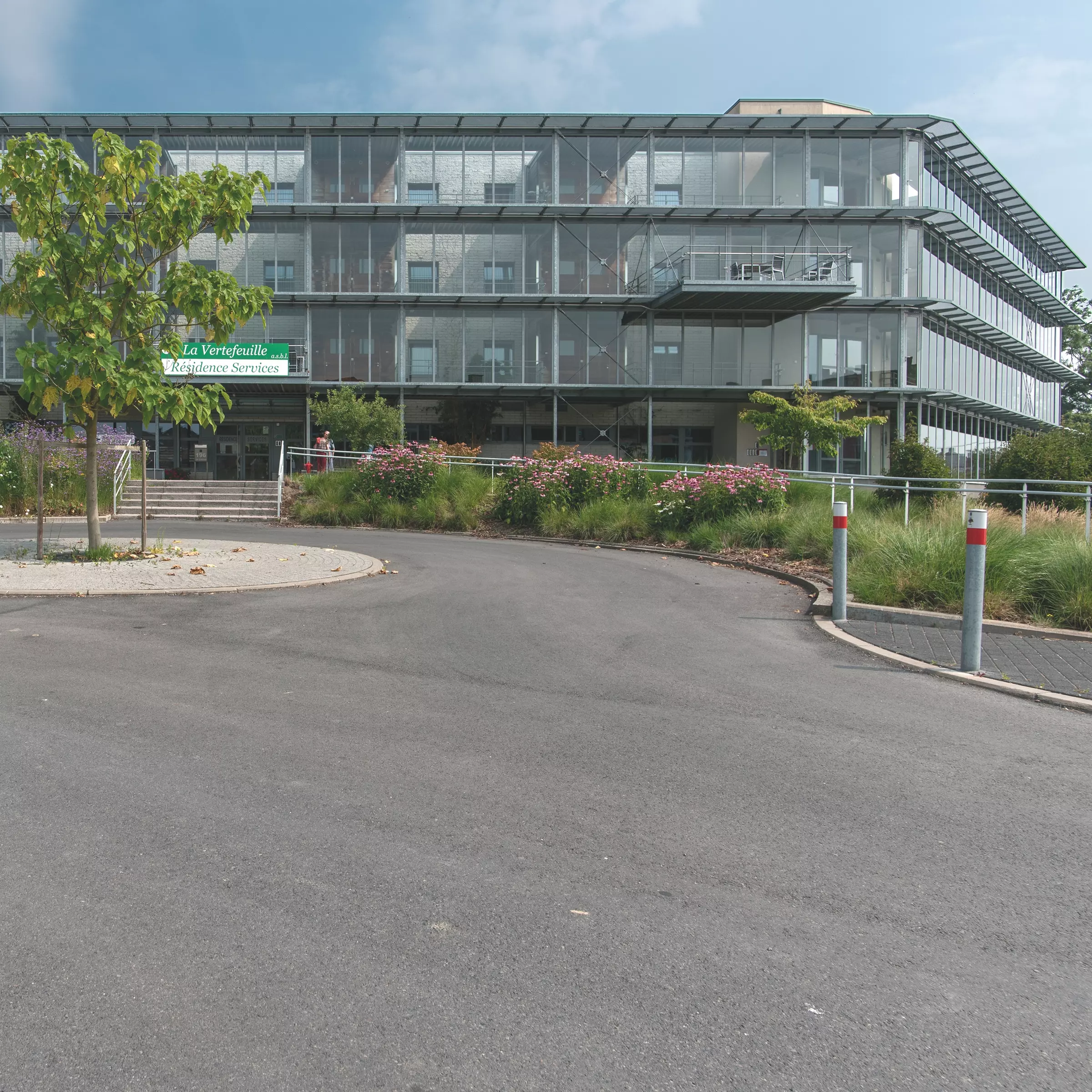 Située en périphérie urbaine, la Vertefeuille regroupe une maison de repos de cent cinquante lits et un immeuble de soixante-quatre logements au sein d'un parc de 8 ha. Inscrit sur les traces d'un ancien couvent, le bâtiment principal s'implante de façon à donner à tous les résidents une vue dégagée sur le paysage. Les appartements, tous traversants, sont desservis au nord par une coursive collective et profitent de balcons privatifs au sud. La coursive forme un espace tampon, clos, mais non chauffé, le long de la chaussée de Renaix. Côté rue, un écran transparent la protège des intempéries. Côté résidence, une série de box en bois donne accès aux habitations. Entre les box, une trémie toute en hauteur dégage un vide pour la circulation de l'air et le développement de plantations. Un microclimat se crée, résultat d'une réflexion spécifique en matière d'énergies renouvelables. Quelques terrasses communes sont suspendues à la structure métallique de la coursive, elle-même fixée ponctuellement sur la construction de béton principale.