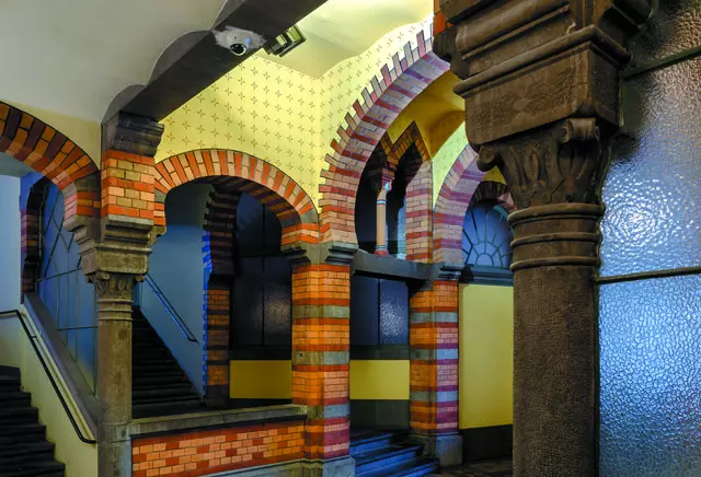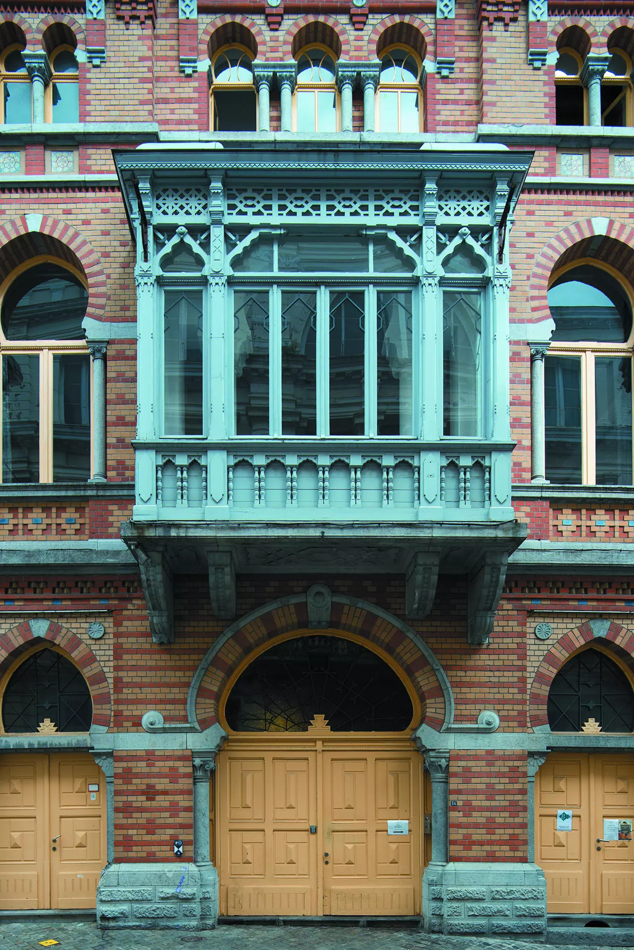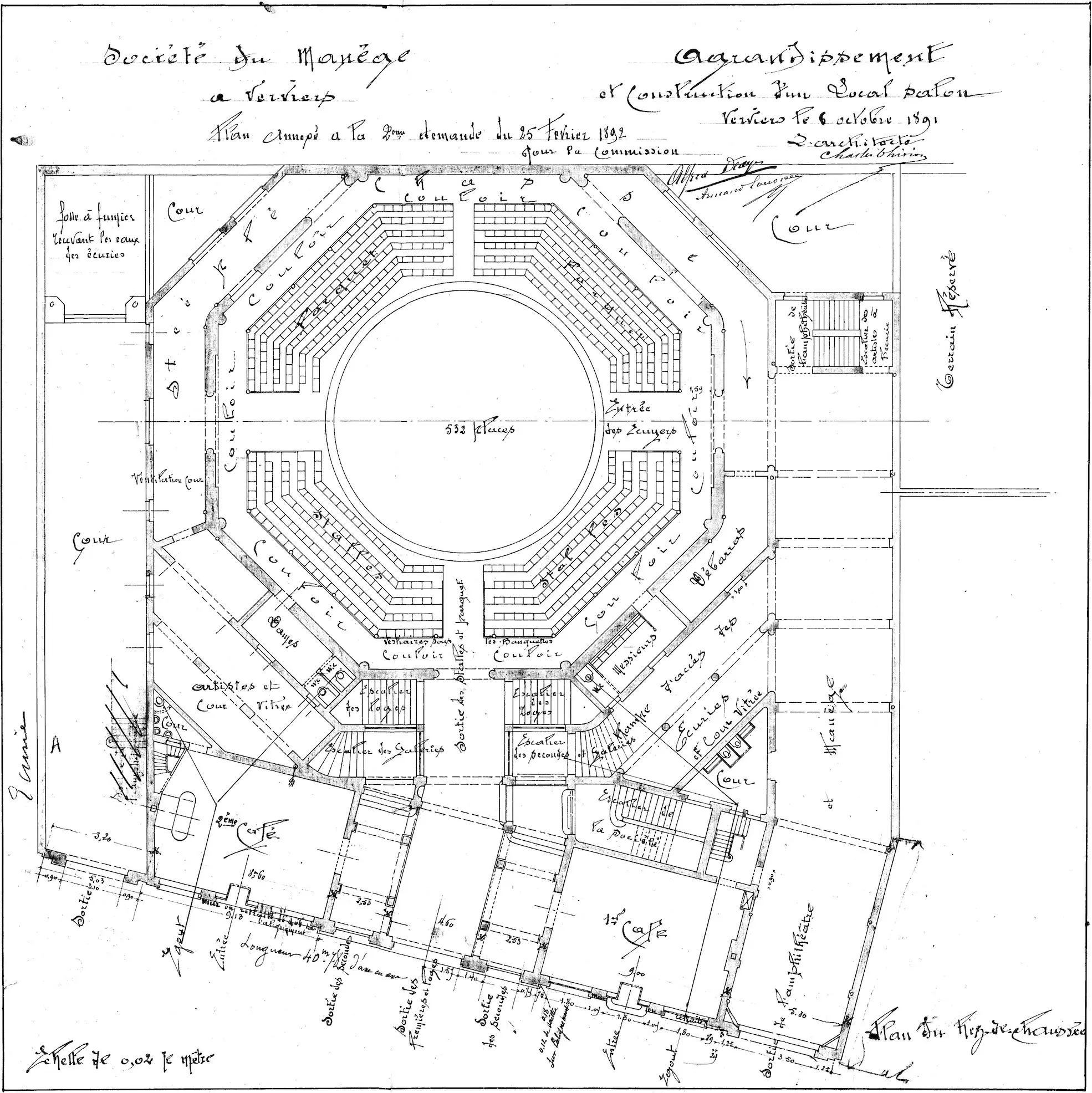 Construit en même temps que le Théâtre(A4) et par le même architecte, le manège, de style néo-mauresque, n'en est séparé que par une rue étroite. À l'origine, la longue façade animée par un jeu de briques polychromes et élevée sur trois niveaux compte neuf travées avec, de part et d'autre, une travée ouverte par un porche.Les baies disposent toutes d'un arc outrepassé. La travée médiane est ornée, au premier étage, d'un bow-window en bois travaillé et porte au sommet un haut-relief sculpté figurant la tête d'un cheval. À l'arrière de ce« rideau » oriental se trouvent la vaste piste octogonale et ses gradins. Conçues par les architectes Charles Thirion et Auguste Vivroux, trois larges travées, dont l'une englobant le porche existant, sont ajoutées en 1909à droite du bâtiment avec, à l'arrière, un autre édifice octogonal, de plus petite dimension. Incendié en 1931, le grand octogone sera transformé en bureaux aux étages selon les plans de Jean Lejaer. Ayant échappé de justesse dans les années 2000 à la démolition, l'édifice est classé, puis restauré et transformé en vingt-neuf logements et six commerces par le bureau d'architecture Crearch.