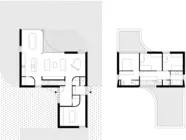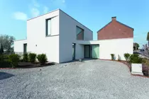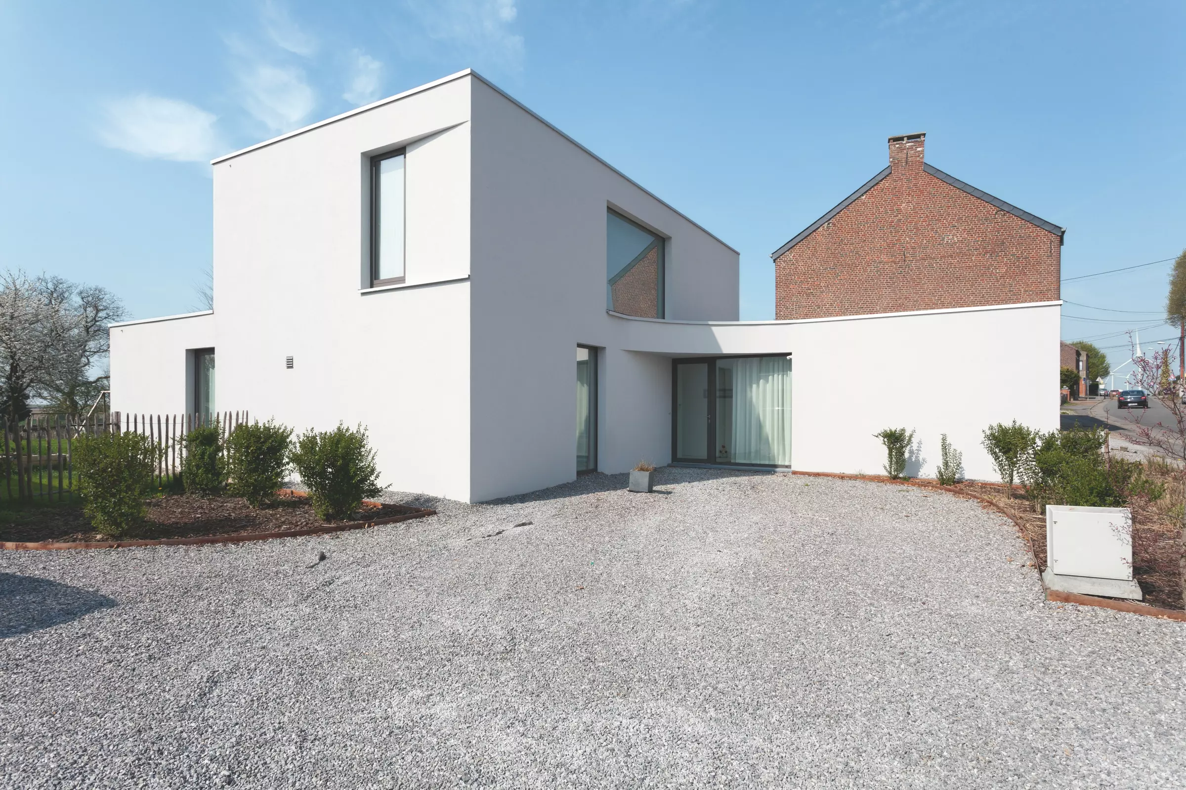 À partir d'un volume principal, deux autres d'un seul niveau s'étirent pour accueillir l'activité professionnelle en façade à rue et la salle à manger qui s'ouvre sur les bocages agricoles en façade arrière. Le volume de la deuxième maison est marqué par un porte-à-faux monumental servant de porche qui définit le seuil.