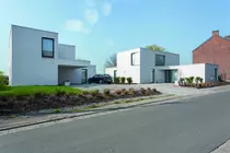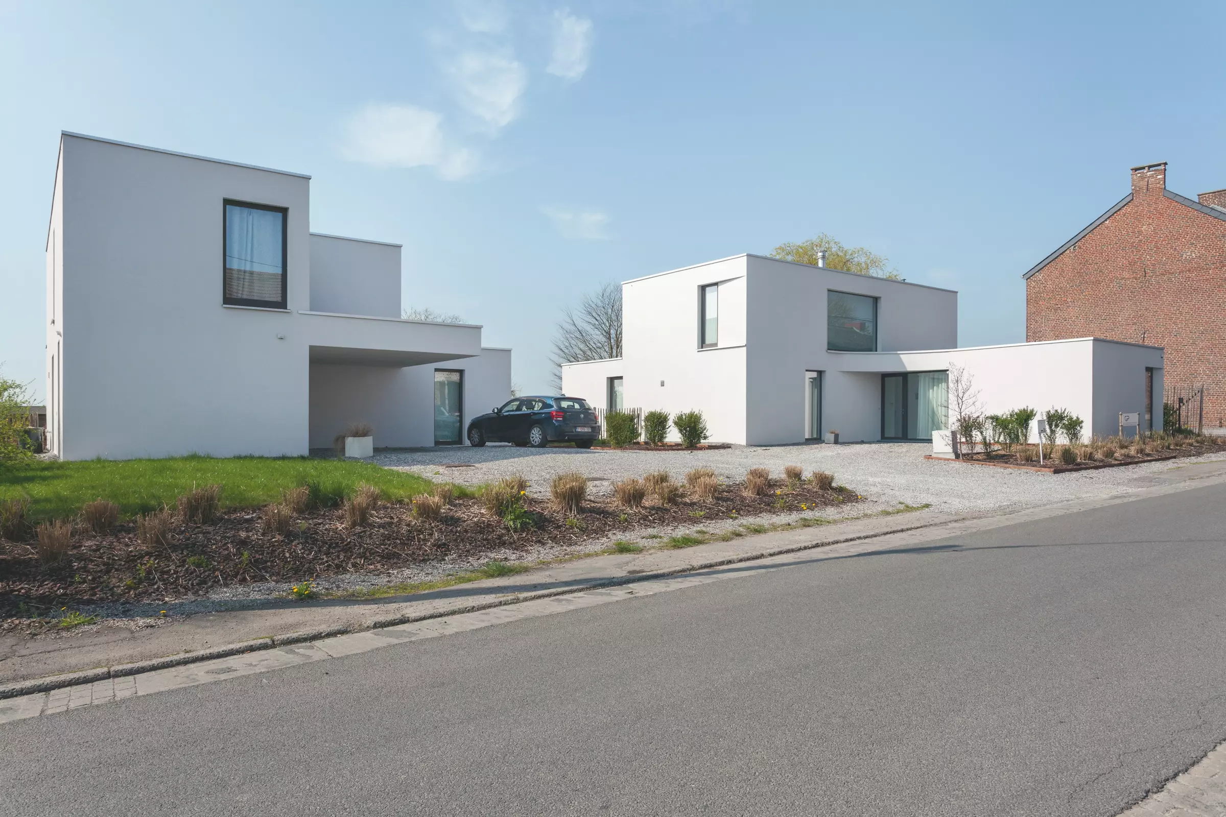 Sur un même terrain qui se situe à l'entrée du village, en zone d'habitat rural, ces deux maisons ont été conçues avec une démarche commune partageant les espaces extérieurs, mais aussi le langage architectural et les principes de composition et de construction.