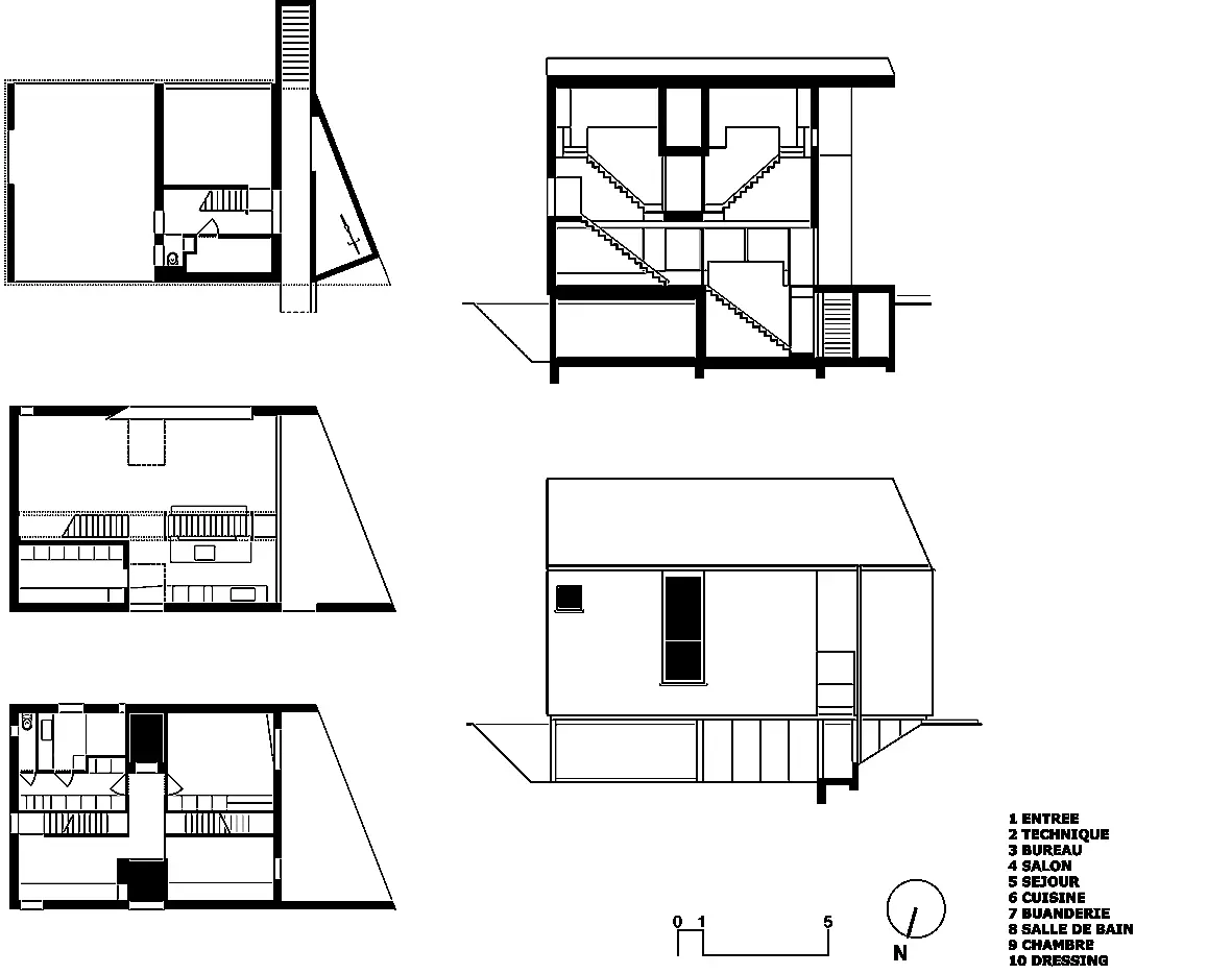 La maison repose sur un socle de béton coffré apparent qui contribue à son esthétique pour des raisons techniques : une nappe phréatique gorge le terrain d'eau. Le volume supérieur est composé de briques carrées et d'enduit blanc, qui rappellent respectivement le pavage des fermes voisines et la couleur de leurs façades.