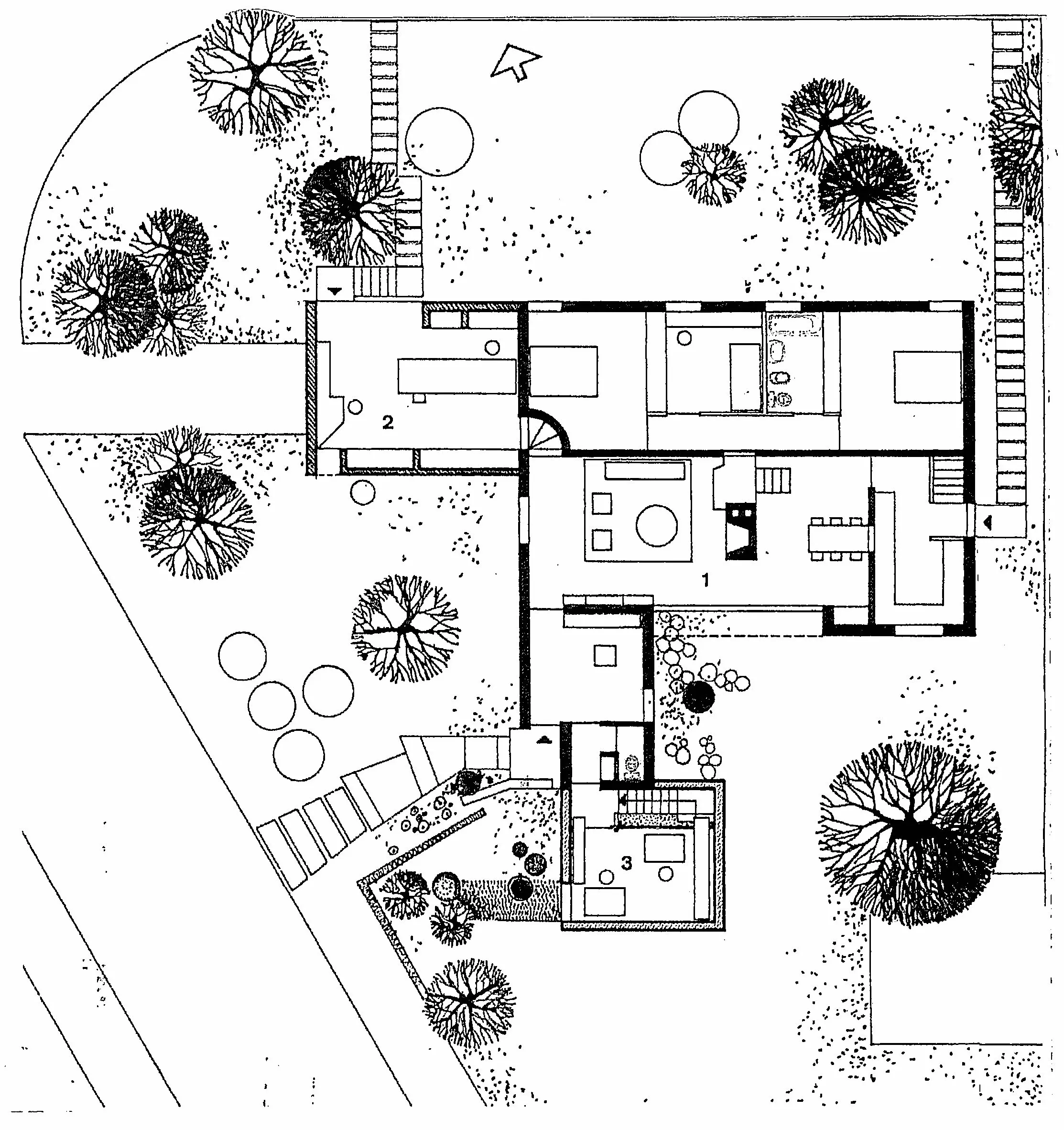 Le projet de Jean Cosse pour sa maison personnelle s’inscrit dans la vision actuelle du développement durable, en dialogue avec l’environnement. Il est situé sur un terrain d’angle triangulaire, dans un lotissement résidentiel très réglementé ; sa coupe en constitue l’élément fondateur. Architecture bioclimatique, elle utilise les orientations, le relief, les angles de vue et la faible déclivité vers le sud pour en déterminer les gabarits et éléments constructifs principaux. Au nord, le bureau et les pièces de nuit se superposent aux garage et services, situés en demi-sous-sol. Au sud, côté jardin, les pièces de vie et l’atelier de dessin, construit par la suite, cadrent le jardin privé, prolongé de haies et murs-écrans en briques qui dilatent l’espace exigu du terrain. Entre ces deux groupes de fonctions, le déboîtement des volumes laisse pénétrer le soleil du sud dans les pièces moins bien orientées ; le débordement de toiture est ajusté de manière à le laisser entrer en mi-saison et en hiver, tout en se protégeant de l’ensoleillement excessif d’été. Le dessin des façades permet d’expérimenter les tracés régulateurs et le carré « plus-que-parfait », plus haut que large, une correction optique qui le rend dynamique par l’ajustage du seuil, du linteau, du dimensionnement. Basée sur un tracé régulateur, l’élévation nord est rythmée par un double carré et deux carrés simples, séparés par les baies verticales vitrées ; elle s’enrichit du garde-corps en béton du palier de l’accès au bureau et de deux petits percements, carrés eux aussi, dans les pleins en maçonnerie. L’assemblage des volumes se marque en élévation ouest, les pignons explicitant le principe de la coupe, ponctués par une baie carrée reprenant le thème principal des ouvertures. La géométrie de la façade sud s’apparente aux autres avec sa grande baie vitrée aux proportions modulées et le percement carré de la cuisine. Comme l’exprime Jean Cosse : « La lumière, traitée comme un matériau palpable, s’associe à l’espace construit pour en modeler la perception et passer du plein éclairage aux zones plus sombres. Ainsi, les espaces se lient, s’enrichissent et se complètent mutuellement pour finalement s’approprier l’extérieur. »